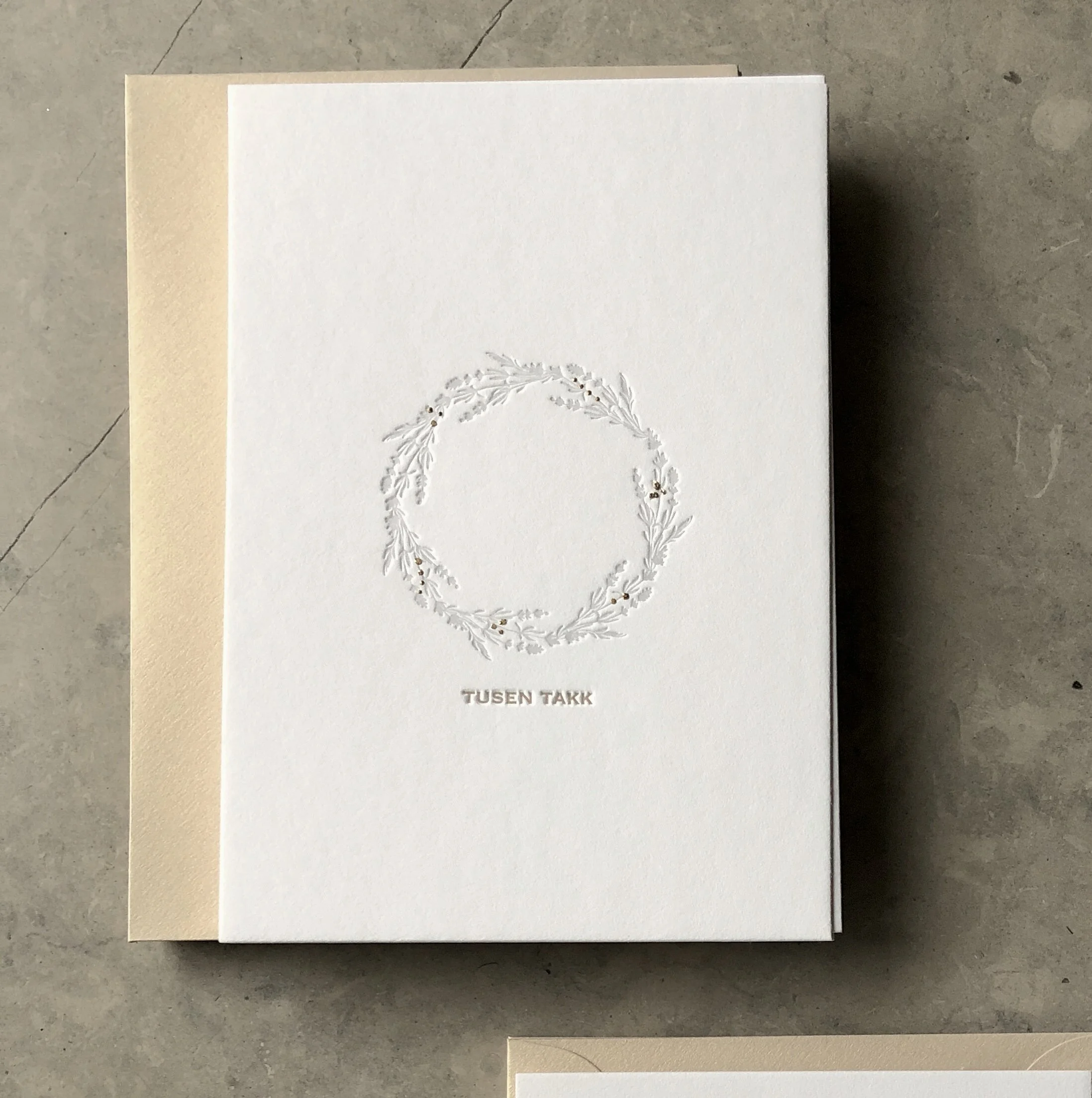 Single A6 card with gold envelope. Letterpressed on cotton paper 540 gram. Wreath design with hand painted gold details on front, blank back.